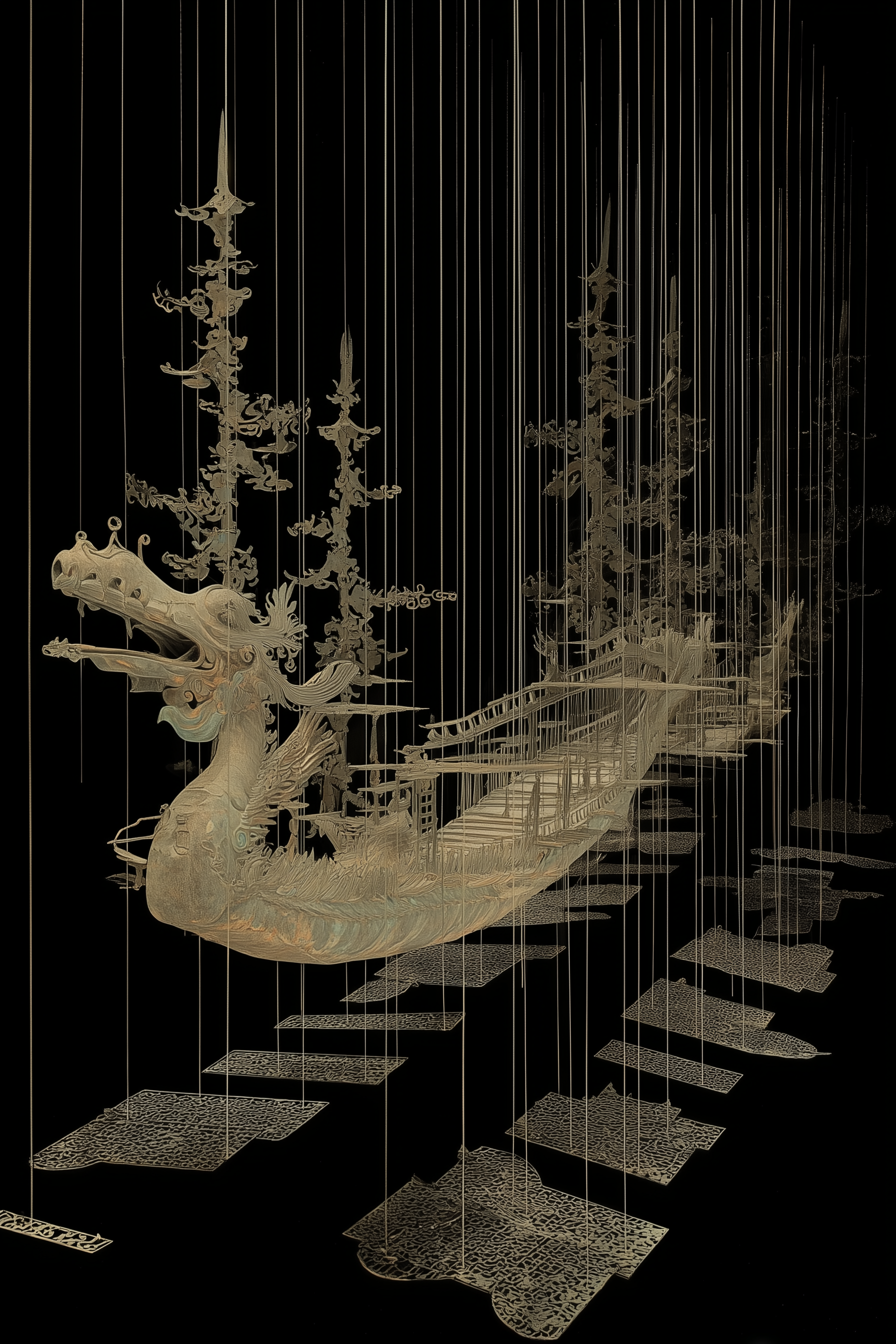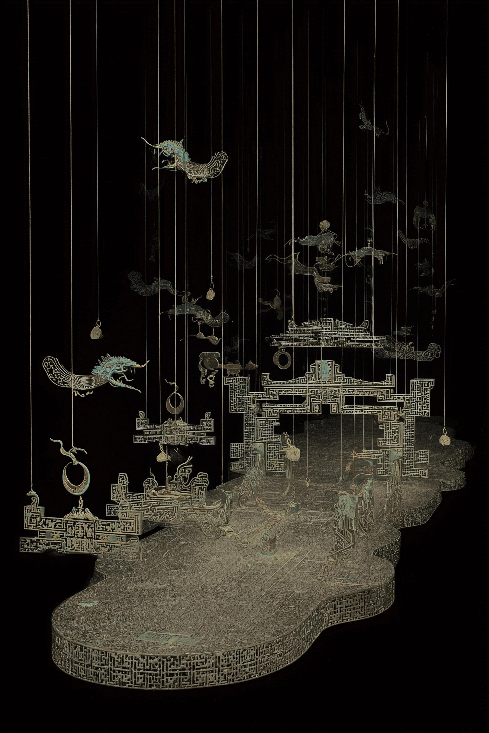 This work tries to combine AI-generated video synthesis with TouchDesigner’s data-tracking processes, the work extends traditional motifs into a shifting audiovisual environment. This experiment seeks resonance between crafted structures and algorithmic flows, revealing new possibilities at the intersection of material presence and digital imagination.